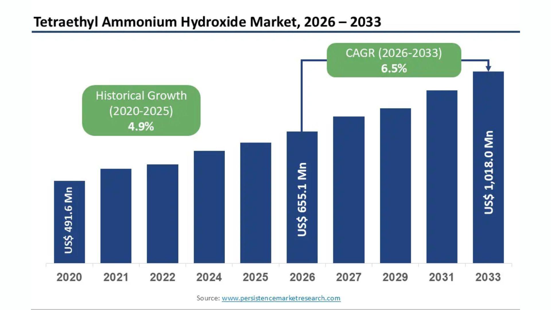 With the market projected to grow from US$ 655.1 Mn in 2026 to US$ 1,018.0 Mn by 2033 at a CAGR of 6.5%, Tetraethyl Ammonium Hydroxide is set to remain a vital component of the global specialty chemicals landscape, offering sustained growth potential for manufacturers and stakeholders alike.