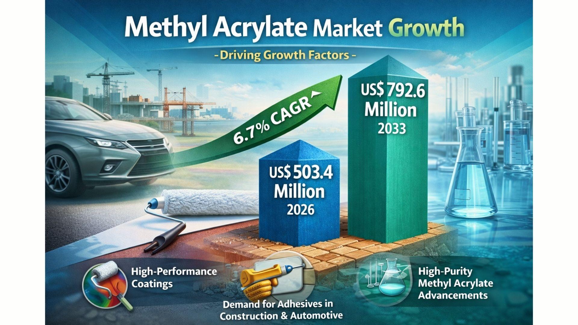According to the Persistence Market Research report, the global methyl acrylate market size is likely to be valued at US$ 503.4 million in 2026 and is expected to reach US$ 792.6 million by 2033. This growth reflects a compound annual growth rate (CAGR) of 6.7% during the forecast period from 2026 to 2033. The steady rise in market value highlights expanding industrial applications, technological advancements in polymerization processes, and growing investments in specialty chemical production.