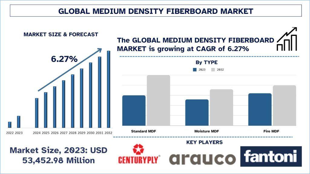 The Medium Density Fiberboard Market was valued at USD 53,452.98 million in 2023 and is expected to grow at a steady CAGR of around 6.27% during the forecast period (2024-2032),