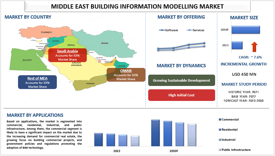 According to a new report by Univdatos The Middle East Building Information Modelling Market was valued at 450 million in 2022 and is expected to grow at a steady rate of around 7.6% in the forecasted period (2023-2030) owing to the growing demand for sustainable and energy-efficient buildings. Building Information Modelling (BIM) is a digital representation of the physical and functional characteristics of a building or infrastructure project. It is a 3D model-based process that allows architects, engineers, contractors, and owners to collaborate and share information throughout the entire lifecycle of a project. The Middle East BIM market is rapidly growing due to the increasing use of digital technologies in the construction industry, and the need for improved collaboration and communication between stakeholders in the construction process.