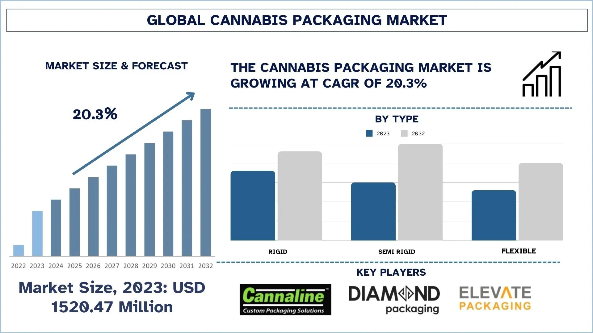 According to the Univdatos, increasing legalization of medical and recreational cannabis, growing consumer demand for sustainable and child-resistant packaging solutions, and stringent government regulations on labeling and safety are driving the growth for the global Cannabis Packaging Market. As per their “Cannabis Packaging Market” report, the global market was valued at USD 1520.47 million in 2023, growing at a CAGR of about 20.3% during the forecast period from 2024 - 2032 to reach USD million by 2032.
