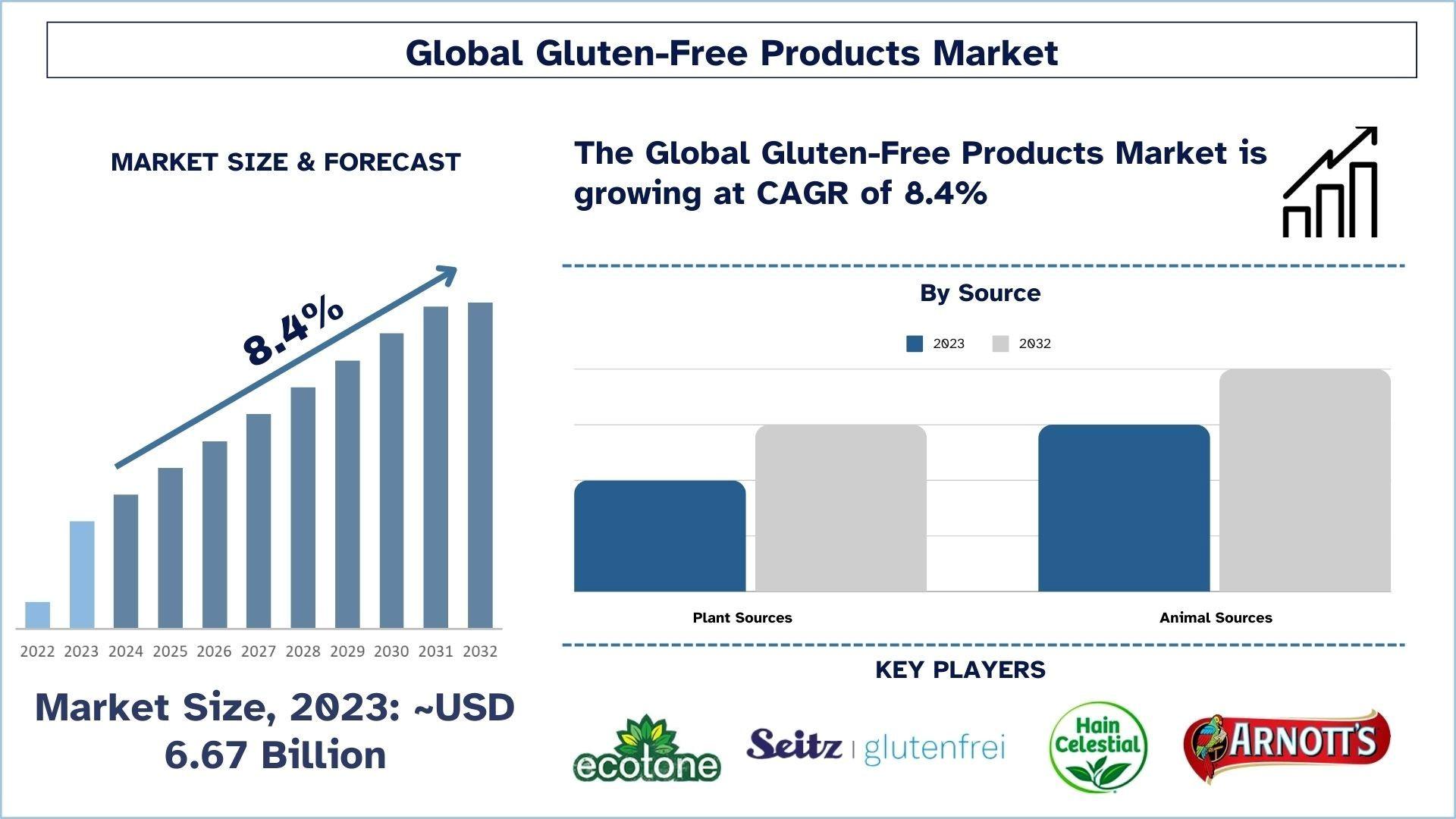 The gluten-free products market is a promising and developing segment of the world’s food market, which shows its continuous growth. A few years ago, it was regarded as a nascent market attributed to changes in health consciousness, dietary habits, and growth in technology. Venturing in this industry is still faced with challenges like high costs and alteration of labels though the potentialities of expansion are enormous especially in the developing world and through innovation. Since people stay more conscious about their health than ever before, the industry is likely to persist as one of the main driving forces of the future food perspective with consumers choosing gluten-free products. According to the UnivDatos, the GLUTEN-FREE PRODUCTS MARKET was valued at USD billion in 2023, growing at a CAGR of 8.4% during the forecast period from 2024 - 2032 to reach USD 13.7 billion by 2032.