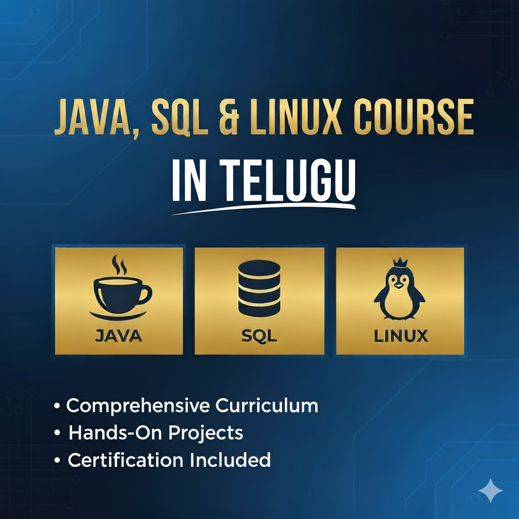Achieve comprehensive real-world IT training with the Java, SQL & Linux course in Telugu. It combines rich theoretical foundations with practical exposure, hands-on projects, and expert guidance, making you job-ready and confident to excel in the evolving IT landscape.