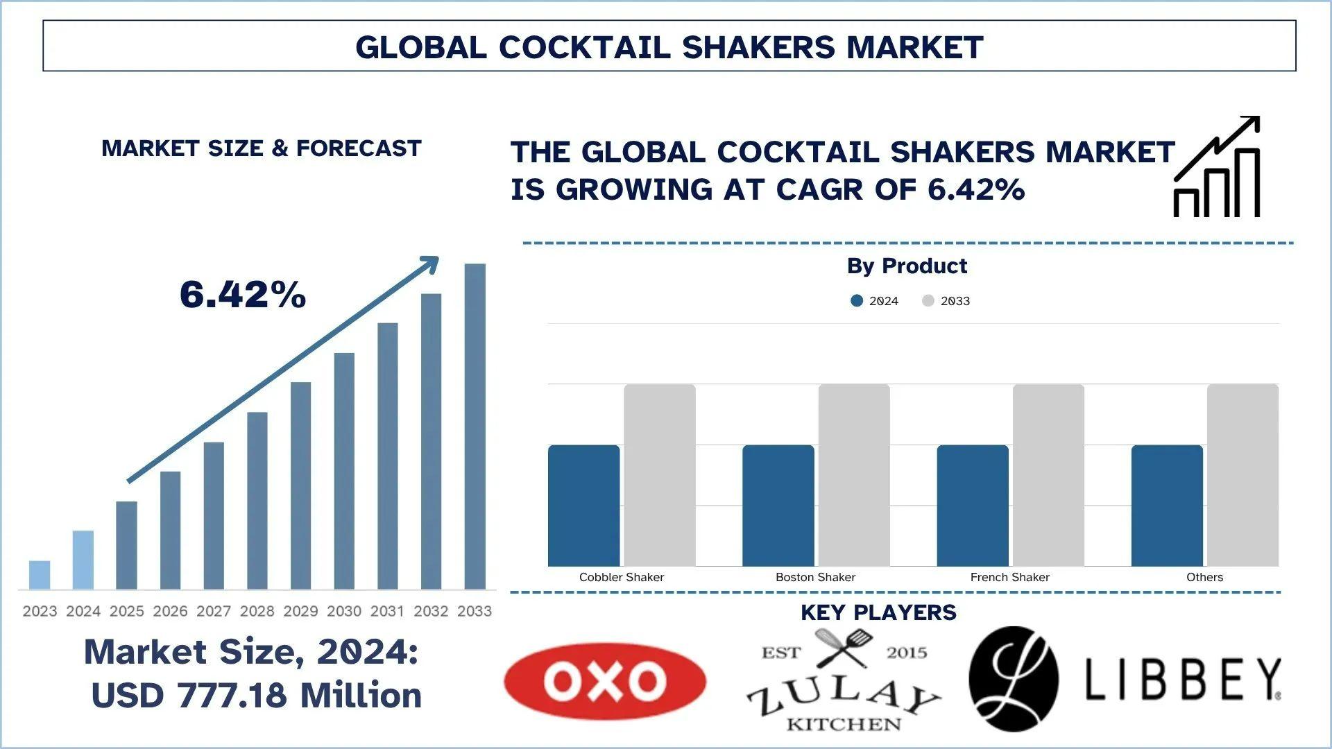 According to UnivDatos analysis, rising global innovation in product design, coupled with increasing at-home bartending and mixology culture, are the major factors driving the growth of the cocktail shakers market. As per their “Cocktail Shakers Market” report, the global market was valued at USD 777.18 million in 2024, growing at a CAGR of about 6.42% during the forecast period from 2025 - 2033 to reach USD million by 2033.