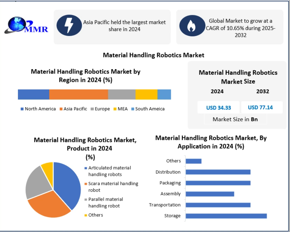 The Global Material Handling Robotics Market was valued at USD 34.33 billion in 2024, and it is projected to reach USD 77.14 billion by 2032, growing at a CAGR of 10.65% during the forecast period (2025–2032).