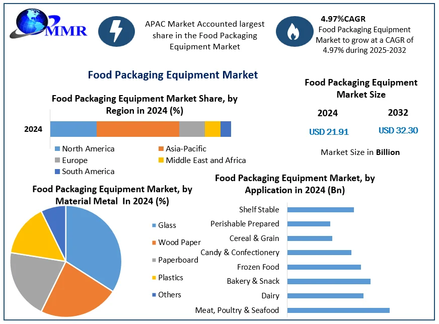 The global Food Packaging Equipment Market was valued at USD 21.91 billion in 2024 and is projected to reach approximately USD 32.30 billion by 2032, expanding at a CAGR of 4.97% from 2025 to 2032. Food packaging equipment is vital for maintaining product stability and safety throughout the supply chain, with applications spanning bakery, confectionery, dairy, meat, poultry, seafood, fruits, vegetables, and convenience foods.