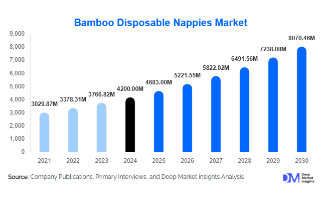 According to Deep Market Insights, the global bamboo disposable nappies market size is projected to grow from USD 4683 Million in 2025 to reach USD 8070.46 Million by 2030, expanding at a CAGR of 11.5% during the forecast period (2025–2030).
