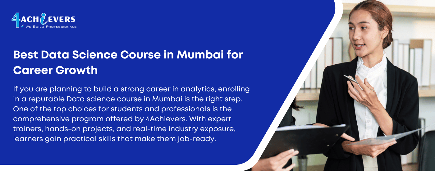 If you are planning to build a strong career in analytics, enrolling in a reputable Data science course in Mumbai is the right step. One of the top choices for students and professionals is the comprehensive program offered by 4Achievers. With expert trainers, hands-on projects, and real-time industry exposure, learners gain practical skills that make them job-ready. To explore complete course details, curriculum, and placement opportunities, visit the official page here: <a href="https://4achievers.com/data-science-training-in-mumbai">Data science course in Mumbai</a>. This training is ideal for beginners as well as working professionals who want to upskill and secure high-paying roles in the data industry.