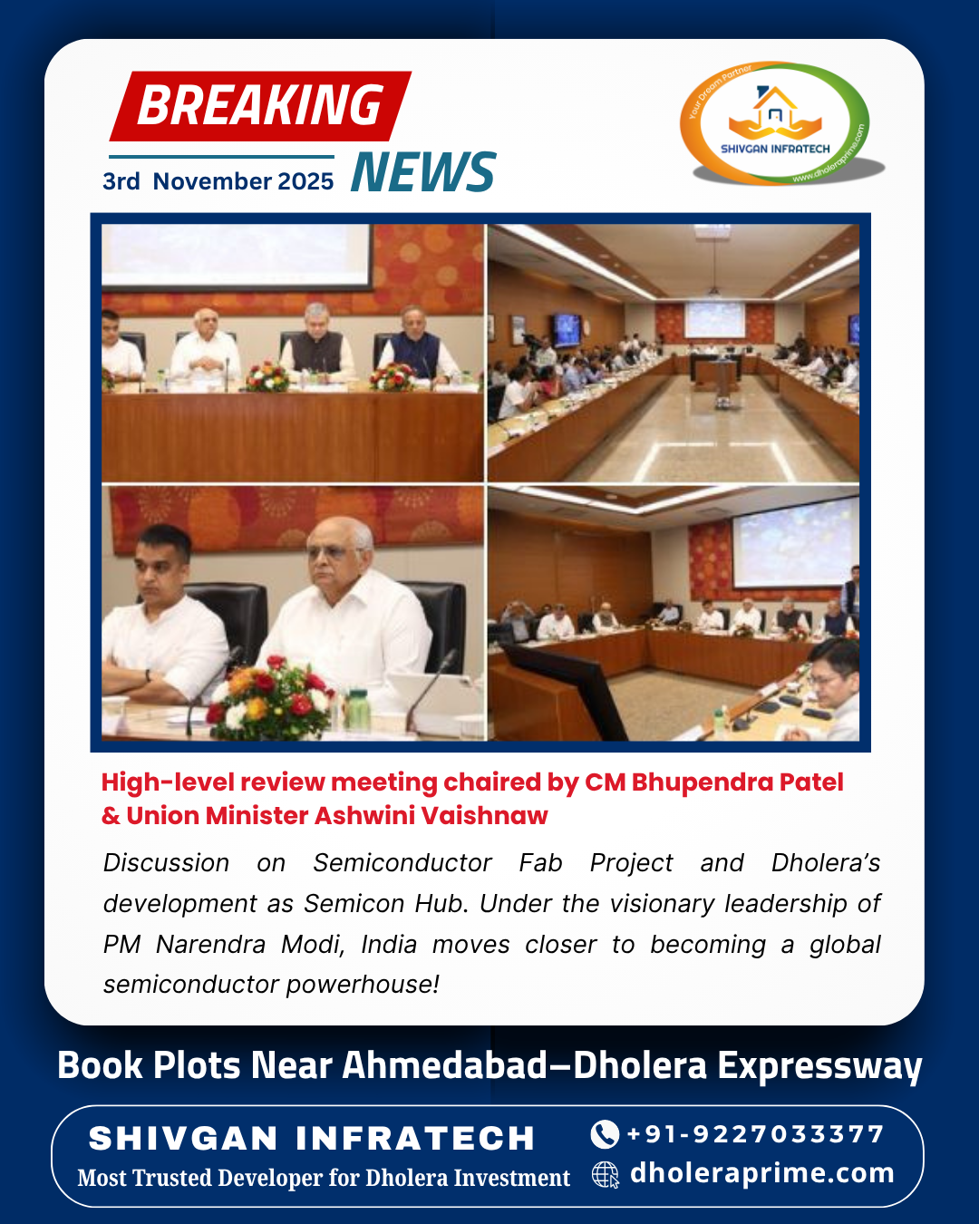 https://www.dholeraprime.com/dholera-plot-live-booking-price-status-and-project-layout/🚨 BREAKING NEWS from Dholera Smart City! 🚨 A high-level review meeting was chaired by Hon’ble CM Bhupendra Patel and Union Minister Ashwini Vaishnaw to accelerate the Semiconductor Fab Project and Dholera’s transformation into India’s first Semicon City. This marks a major step toward making India a global semiconductor manufacturing hub, driving massive growth and innovation under the visionary leadership of Prime Minister Shri Narendra Modi. 🔥As Dholera emerges as the next big technology and investment destination, property values are expected to soar — making it the perfect time to invest in plots near Ahmedabad–Dholera Expressway. Shivgan Infratech – the most trusted developer for Dholera investment For Live Plot Booking Status Call/WhatsApp: 09227033377 https://www.dholeraprime.com/dholera-plot-live-booking-price-status-and-project-layout/0 Comments 0 Shares 32 Views 0 Reviews -