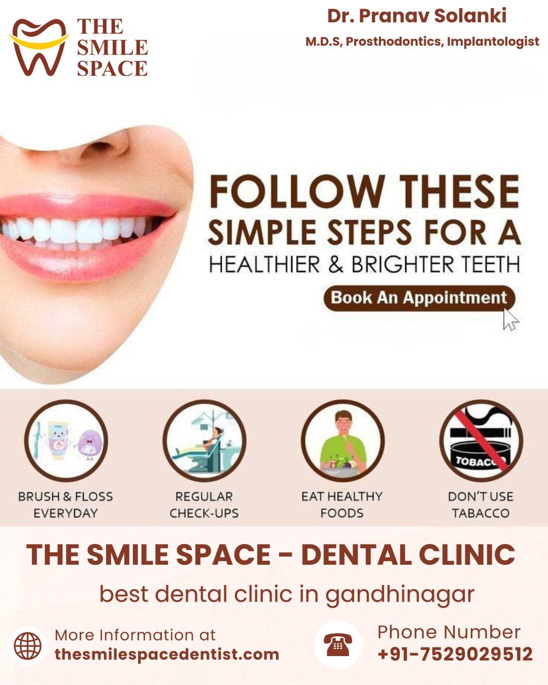 ✨ Want Naturally Healthier & Brighter Teeth? The Smile Space brings you expert dental care with simple daily habits that transform your smile! 🦷 Brush & Floss Every Day 🪥 Schedule Regular Dental Check-Ups 🍎 Choose Healthy Food 🚭 Avoid Tobacco Get personalised care from Dr. Pranav Solanki (M.D.S., Prosthodontics, Implantologist) for long-lasting dental health. 📅 Book your appointment today! 📍 Best Dental Clinic in Gandhinagar 🔗 https://thesmilespacedentist.com/ 📞 +91-7529029512