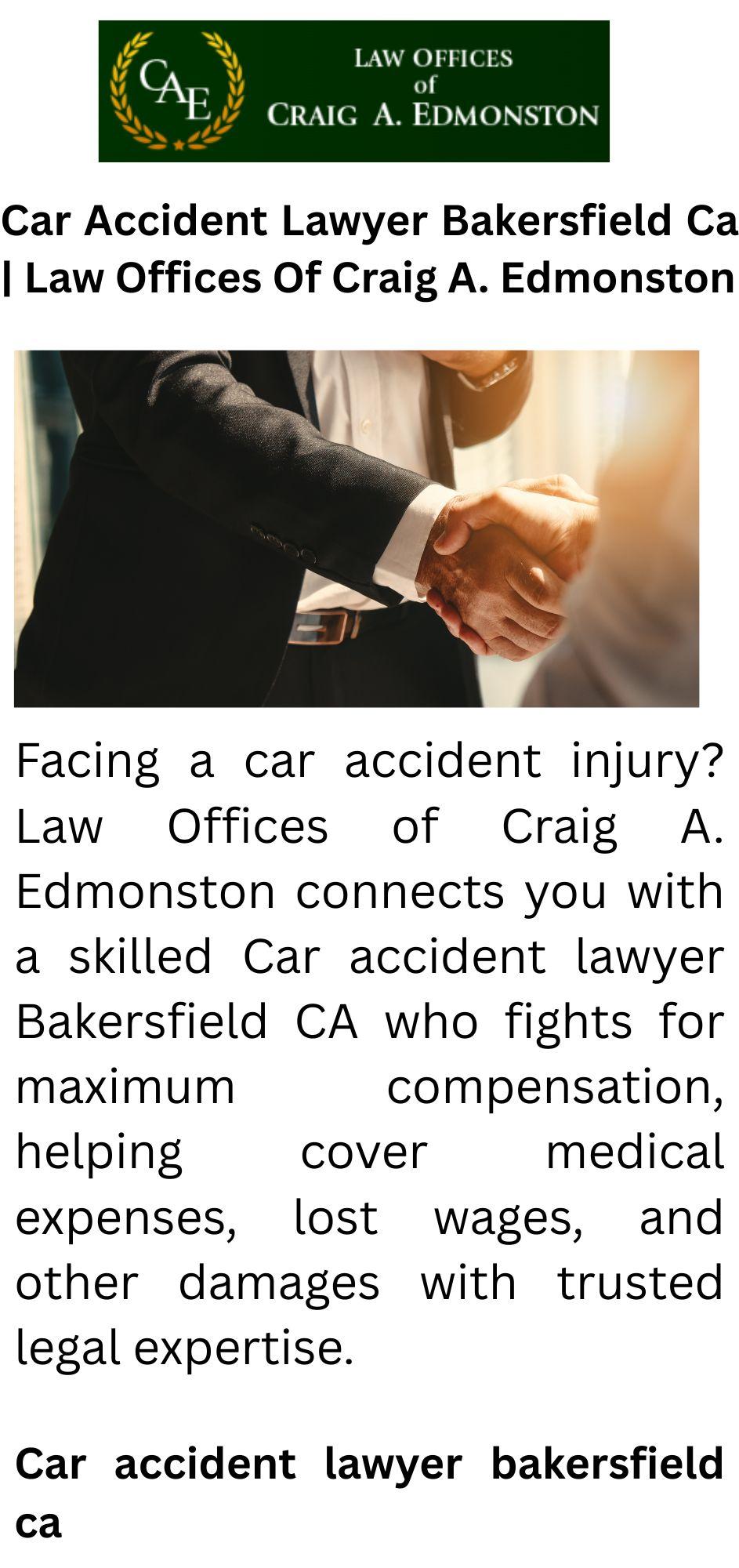 Facing a car accident injury? Law Offices of Craig A. Edmonston connects you with a skilled Car accident lawyer Bakersfield CA who fights for maximum compensation, helping cover medical expenses, lost wages, and other damages with trusted legal expertise.
