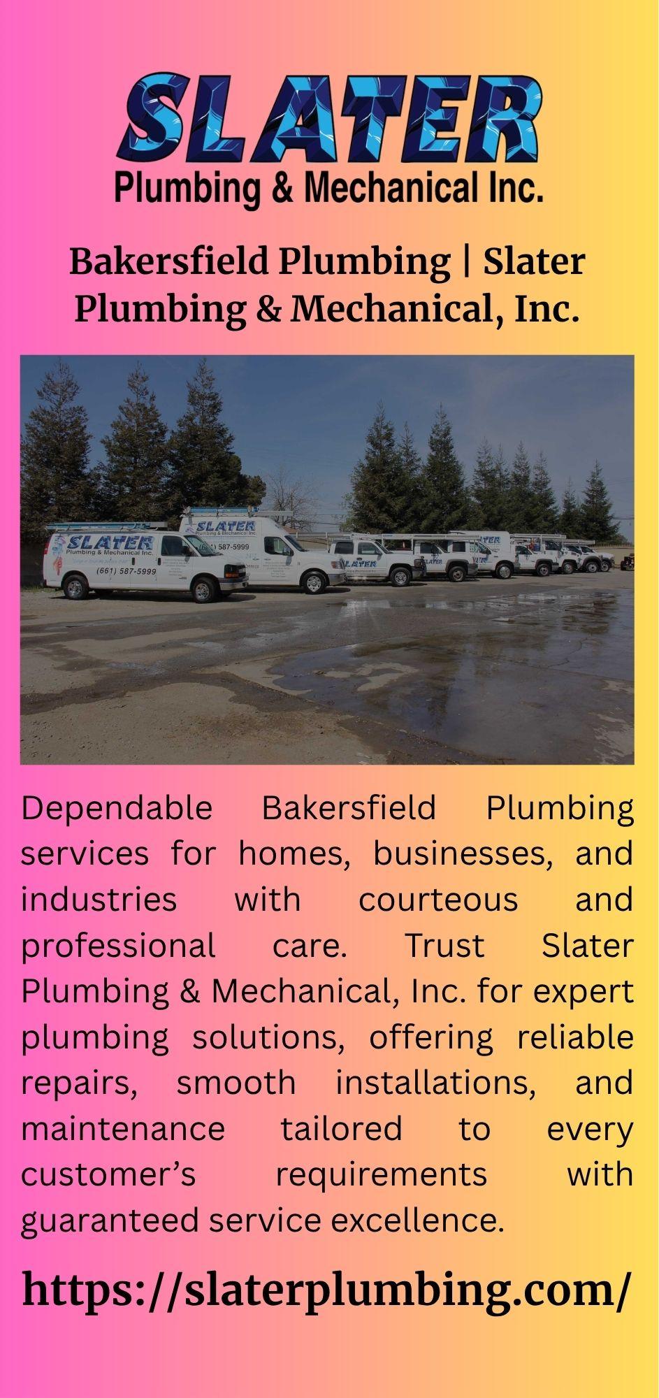 Dependable Bakersfield Plumbing services for homes, businesses, and industries with courteous and professional care. Trust Slater Plumbing & Mechanical, Inc. for expert plumbing solutions, offering reliable repairs, smooth installations, and maintenance tailored to every customer’s requirements with guaranteed service excellence.